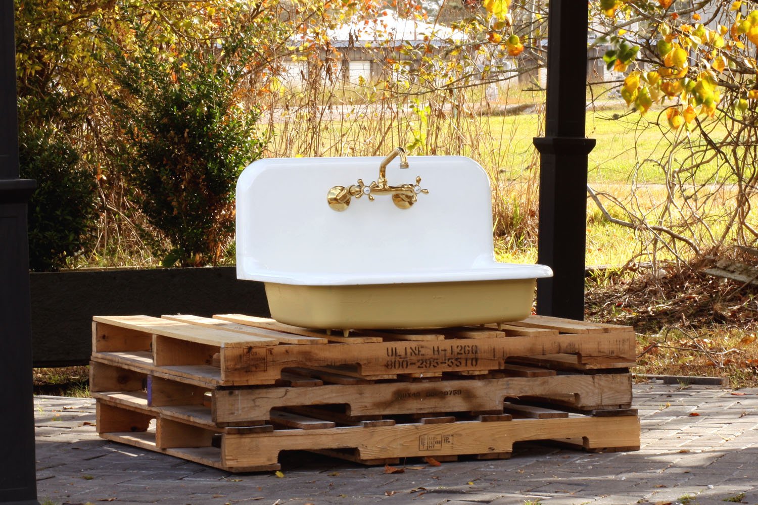 The 42" Cast Iron Wall-Hung Kitchen Sink replicates early American designs and is made to stand the test of time. The left side features a fluted drainboard, while the right has a deep well for washing.