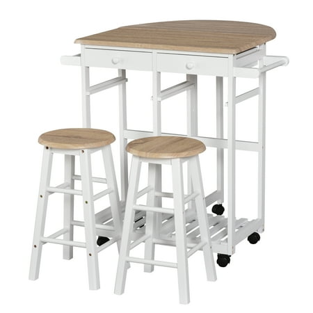 HOMCOM 3 Piece Kitchen Cart Set Drop Leaf Breakfast Table and 2 Stools with Rolling Wheels for Living Room Dorm Apartment
