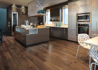 Pictures of Hardwood, Vinyl, and More Kitchen Flooring Here's another kitchen featuring hardwood flooring, but the effect is dramatically different. A rich, dark walnut color, the floor in this picture gives the room a smoky, understated sense of dignity and authority. This allows the use of more formal accessories such as the steel oven vent and the scrollwork bar stools against the breakfast nook.