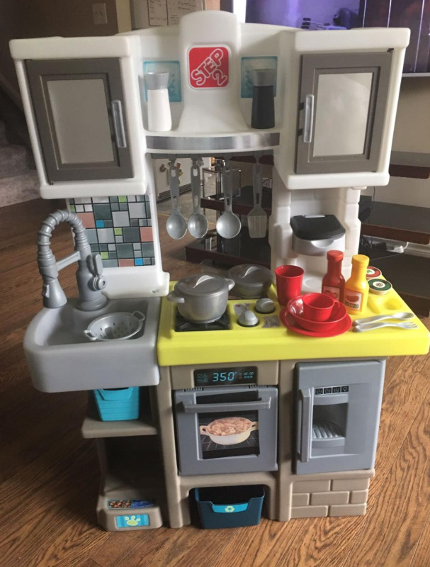 Step 2 Modern Cook Kitchen with Bonus 25 Piece Accessories - Walmart.com This Step2 kitchen comes with a bonus 25-piece accessory set, including recycling bin, flatware and more. Step2 Modern Cook Kitchen with Bonus 25-Piece Accessories: Stove burner features fun lights, sounds and clicking knobs for more realistic play. Special frying pan and boiling pot activate electronic frying and boiling water sounds.