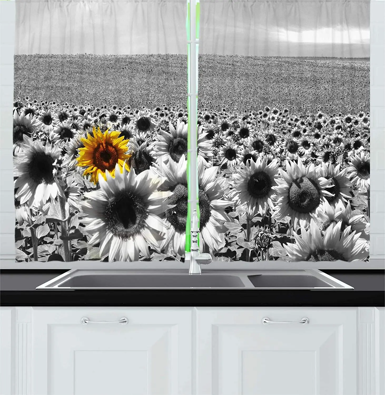 Modern Kitchen Curtains Sunflower Field Black and White with a Single Yellow Flower Spring Landscape Individuality Window Drapes