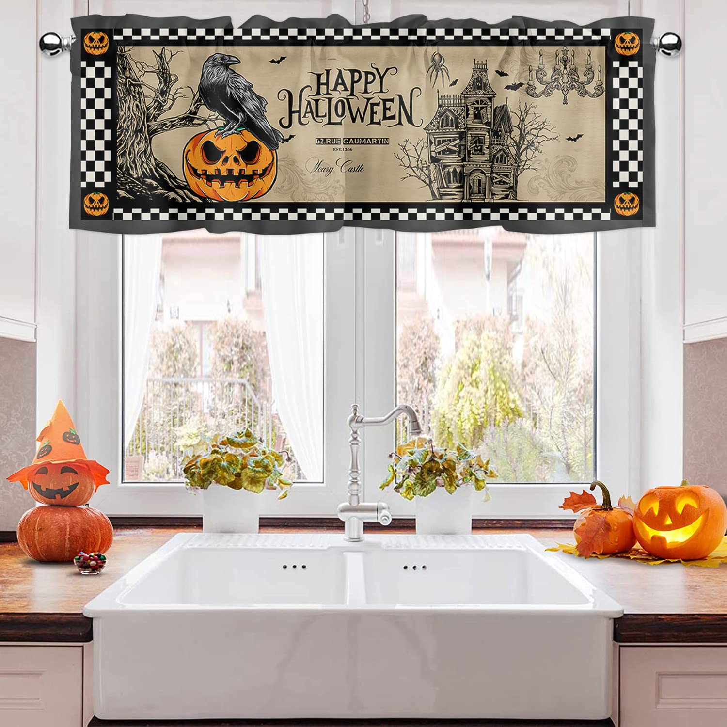Valance Curtain for Kitchen,Happy Halloween Black Crow Orange Pumpkin Black White Check Valances for Living Room Scroll,Rod Pocket Valances for ...