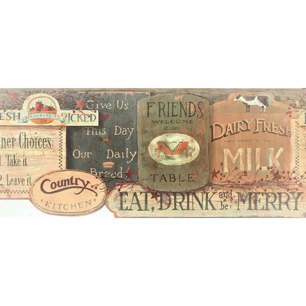 Concord Wallcoverings Wallpaper Border Retro Country Kitchen Pattern Wooden Signs, Colors White Brown Red Light Green, Size 10 Inches by 15 Feet ...