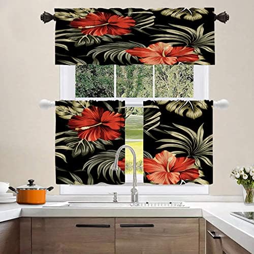Shrahala Tropical Vintage Red Kitchen Valances Half Window Curtain, Tropical Vintage Red Hibiscus Floral Green Palm Leaves Kitchen Valance for Window ...