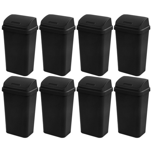 Sterilite 13 Gallon Plastic Swing Top Spave Saving Flat Side Lidded Wastebasket Trash Can for Kitchen, Garage, or Workspace, Black (8 Pack)