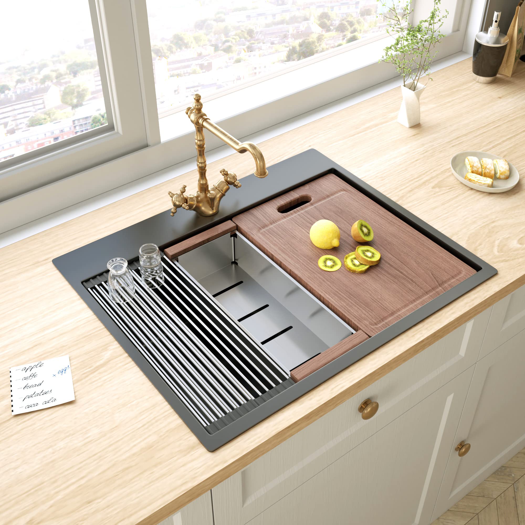 27 Inch Farmhouse Kitchen Sink Gunmetal Black Apron Front 16 Gauge Stainless Steel Deep Single Bowl Kitchen Farm Sinks