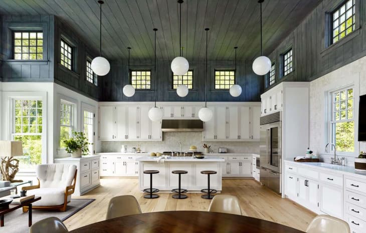 17 Cozy and Chic White Kitchens with Wood Beams - Soul & Lane This beautiful white kitchen finds its wooden beams right over the range hood to offer both functional and visual support to the corner. Subtle wooden accents—from boards, and shelves, and organized cabinetry—make this room look fuss-free and elegant. The white oak flooring and pop of greenery add to the charm of this neutral space. Kitchens White Wood Ceiling Design Ideas - DecorPad A white wood plank ceiling accented with wood beams, a two toned hood is mounted against white herringbone backsplash tiles between black framed windows lit by brass sconces. Hibou Design Co. White shaker island with gray wicker stools illuminated by a set of brass island lanterns in a transitional white kitchen. Wood Kitchen Ceiling (Design Ideas) - Designing Idea Typically, a solid wood ceiling could cost around $1.50 per square foot for the materials, and another $2-$3.5 per square foot for professional installation. Price would vary depending on the chosen material. This contemporary kitchen design uses bleached & gray-stained solid wood for its ceiling. It uses tongue and groove joints for a cleaner ... 101 Kitchen Ceilings with Exposed Wood Beams (Photos) - Home Stratosphere This kitchen boasts a ceiling with exposed beams lighted by a stylish pendant lighting. There's a medium-sized center island with a white granite countertop set on the hardwood flooring. Large kitchen with its own fireplace. The white counters and center island both feature marble countertops. The kitchen also features a skylight set on the ...